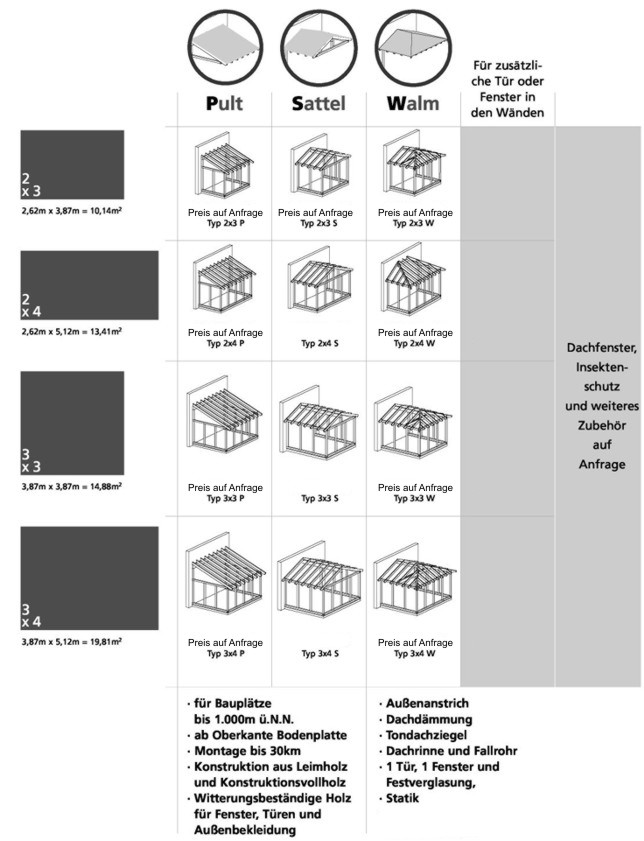 Wir Peniero-Zimmermeister bauen Ihnen einen Wintergarten nach Ihren Wünschen. Sie haben die Möglichkeit, aus vielen Größen auszuwählen und die Dachform zu bestimmen.
